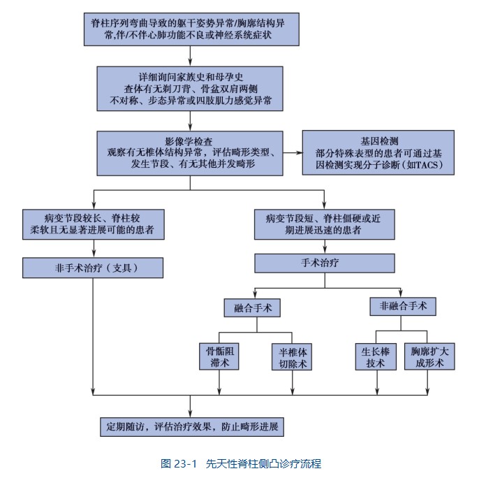 CS 相较于其他类型的脊柱侧弯具有起病早、进展快、畸形重、并发症多等特点, 严重者可能继发心肺功能不全、神经功能受损。多数 CS 患者接受手术治疗后长期预后良好,但需要定期随诊。有生长需要的患儿需定期进行撑开手术。总体治疗原则如下: