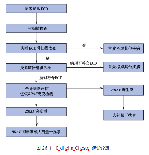 存在 BRAFV600E 突变患者可以首选 BRAF 抑制剂维莫非尼(vemurafenib) 治疗。而BRAF 野生型患者可首选大剂量干扰素治疗(600~900MIU,3 次 / 周),或聚乙二醇干扰素2α:135~200μg/ 周。对于难治复发 ECD 患者的其他治疗选择包括重组 IL-1 抑制剂阿那白滞素、克拉屈滨、阿糖胞苷、西罗莫司等。由于发现 ECD 是一种 MAPK 信号通路激活为特征的克隆性血液系统肿瘤,因此国外已有研究使用 MEK 抑制剂治疗,然而国内尚无此药。