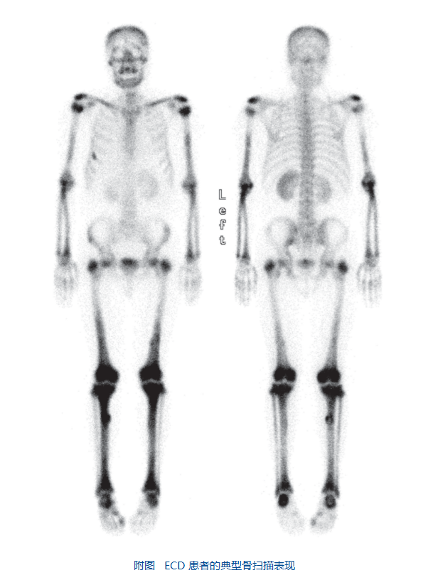 1. 骨骼系统 绝大多数 ECD 患者在诊断时候都有骨骼受累,以下肢骨最为常见,但仅有 50%患者有骨痛表现。