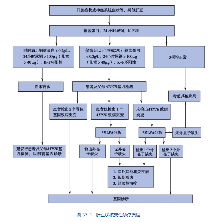 根据国内 2008 年肝豆状核变性的诊断与治疗指南,患者具有锥体外系症状或肝病表现,K-F 环阳性,血清铜蓝蛋白低于 0.2g/L,24 小时尿铜 >100μg(儿童 24 小时尿铜>40μg),可临床诊断为肝豆状核变性。对不符合以上诊断指标的患者,应进一步行 ATP7B基因突变检测,发现 2 个等位基因致病突变具有确诊价值。
