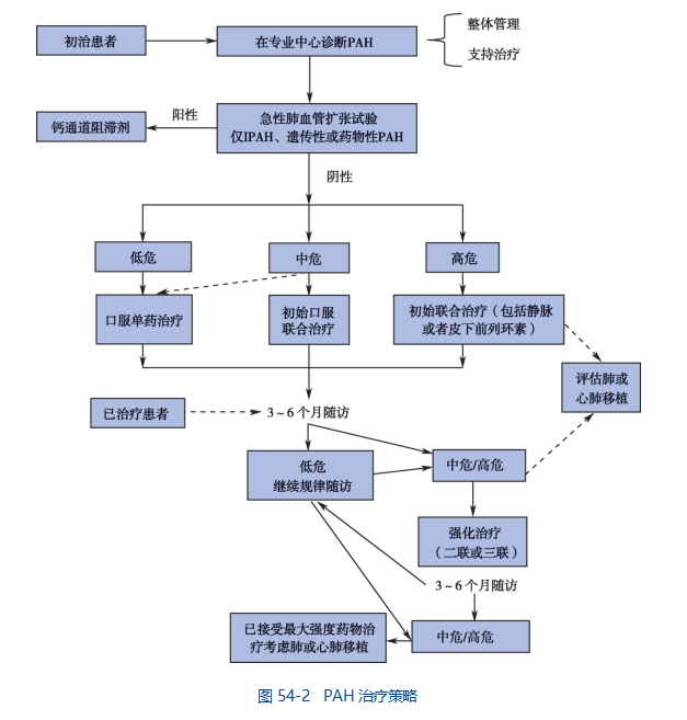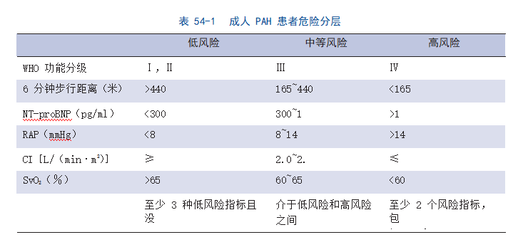 4. 靶向药物联合治疗 尽管近年来靶向药物治疗取得巨大进展,但 IPAH 患者长期预后仍不理想,理论上联合治疗较单药治疗疗效更好。IPAH 靶向药物联合治疗有序贯联合治疗和起始联合治疗两种策略,均可显著减少临床恶化事件发生。建议使用简化的危险分层量表对 IPAH 进行危险分层(表 54-1),根据分层结果制定相应治疗策略(图 54-2)。