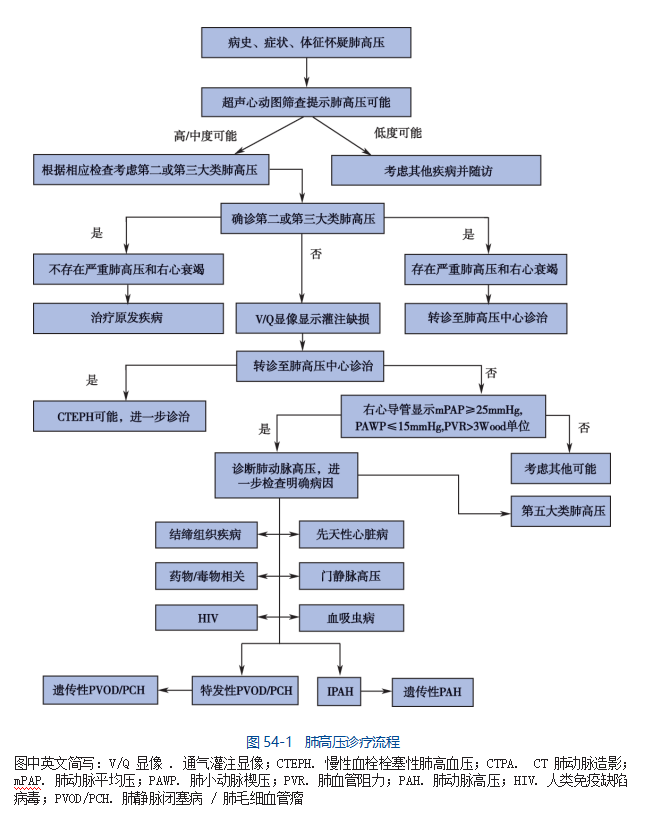 出现活动耐量减低和外周水肿时需要与左心衰、心包疾病、肝脏疾病及腔静脉病变进行鉴别诊断。此外,还需与其他可能导致肺高血压的疾病进行鉴别,包括肝脏疾病、结缔组织病、先天性分流性心脏病、肺血管疾病、感染性疾病、血液性疾病、左心疾病、肺部疾病及慢性血栓栓塞性肺高血压等。图 54-1 为肺高压诊疗流程图。