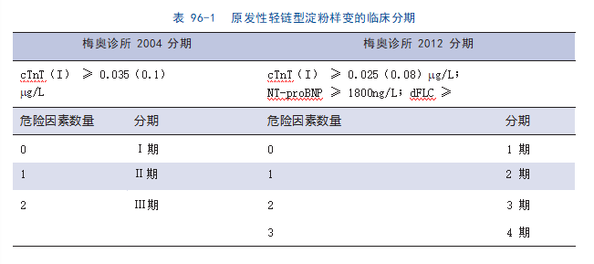 2. 危险分层 原发性轻链型淀粉样变患者的预后与心脏受累严重程度密切相关。目前淀粉样变危险分层主要采用梅奥分期和修正分期(表 96-1)。按 2004 梅奥分期标准,北京协和医院Ⅰ、Ⅱ及Ⅲ期患者的中位生存期分别为 65 个月、30 个月及 11 个月。