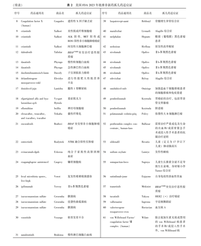 表 2美国FDA 2023年批准非新药孤儿药适应证