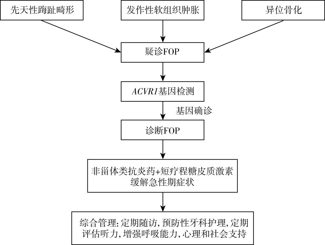 FOP是一种经分子遗传学证实的临床诊断。儿童出现先天性踇趾畸形、进行性软组织肿胀和头部或背部结节应考虑FOP的可能性。对于高度怀疑FOP的患者,在完善影像学检查的基础上,通过基因检测明确诊断。软组织病变的穿刺活检可能会引起急性发作,应尽量避免。