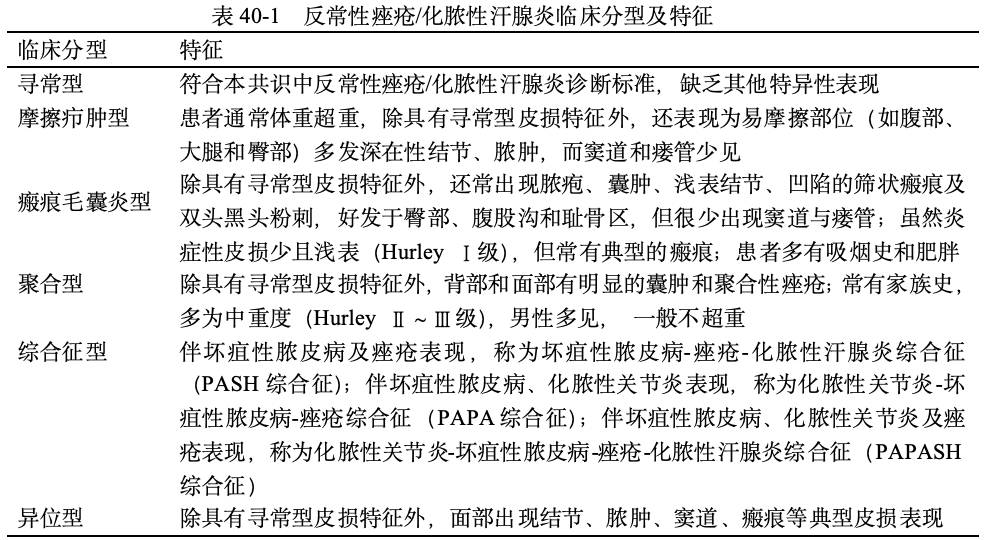 HS/AI的典型皮损表现为成对出现的黑头粉刺、炎症性丘疹、结节、囊肿、脓肿、窦道和瘘管,后期可出现皮肤挛缩及瘢痕形成,部分患者还可合并藏毛窦。皮损反复发作,引起患者疼痛或明显触痛。本病可伴随或继发多种系统性疾病及表现,如糖尿病、淋巴水肿、贫血、低蛋白血症、自身炎症性疾病[尤其是炎症性肠病、炎症性关节病、滑膜炎-痤疮-脓疱病-骨肥厚-骨炎(synovitis-acne-pustulosis-hyperostosis-osteitis,SAPHO)综合征、坏疽性脓皮病-痤疮-化脓性汗腺炎综合征(PASH综合征)、化脓性关节炎-坏疽性脓皮病-痤疮综合征(PAPA综合征);化脓性关节炎-坏疽性脓皮病-痤疮-化脓性汗腺炎综合征(PAPASH综合征)等],患者发生抑郁与焦虑等不少见,长期慢性溃疡性皮损可继发鳞状细胞癌等。根据临床表型不同,HS/AI可分为寻常型、摩擦疖肿型、瘢痕毛囊炎型、聚合型、综合征型及异位型,各型特征见表40-1。HS合并聚合性痤疮、头部脓肿性穿掘性毛囊炎及毛囊周围炎时称为毛囊闭锁三联征,如同时伴有藏毛窦则被称为毛囊闭锁四联症。