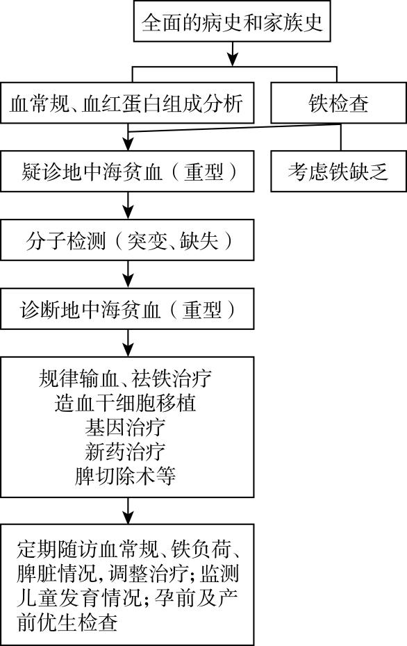 概述 地中海贫血(thalassemia)是人类最常见的一种异质性隐性遗传的单基因疾病,由于珠蛋白生成不足或缺失导致不同程度的贫血,包括α地中海贫血和β地中海贫血,在地中海人群、中东、印度次大陆和缅甸都有较高的基因频率,我国长江以南10个省份也是地中海贫血的高发区。地中海贫血(重型)(Thalassemia major)为重型珠蛋白生成障碍性贫血,包括重型α地中海贫血和重型β地中海贫血。重型α-地中海贫血通常在宫内死亡或者出生后不久死亡。重型β-地中海贫血常于婴儿期发病,呈慢性进行性溶血性贫血,严重威胁患儿生存质量甚至生命。如无特别说明,本节中的地中海贫血(重型)专指重型β-地中海贫血。
