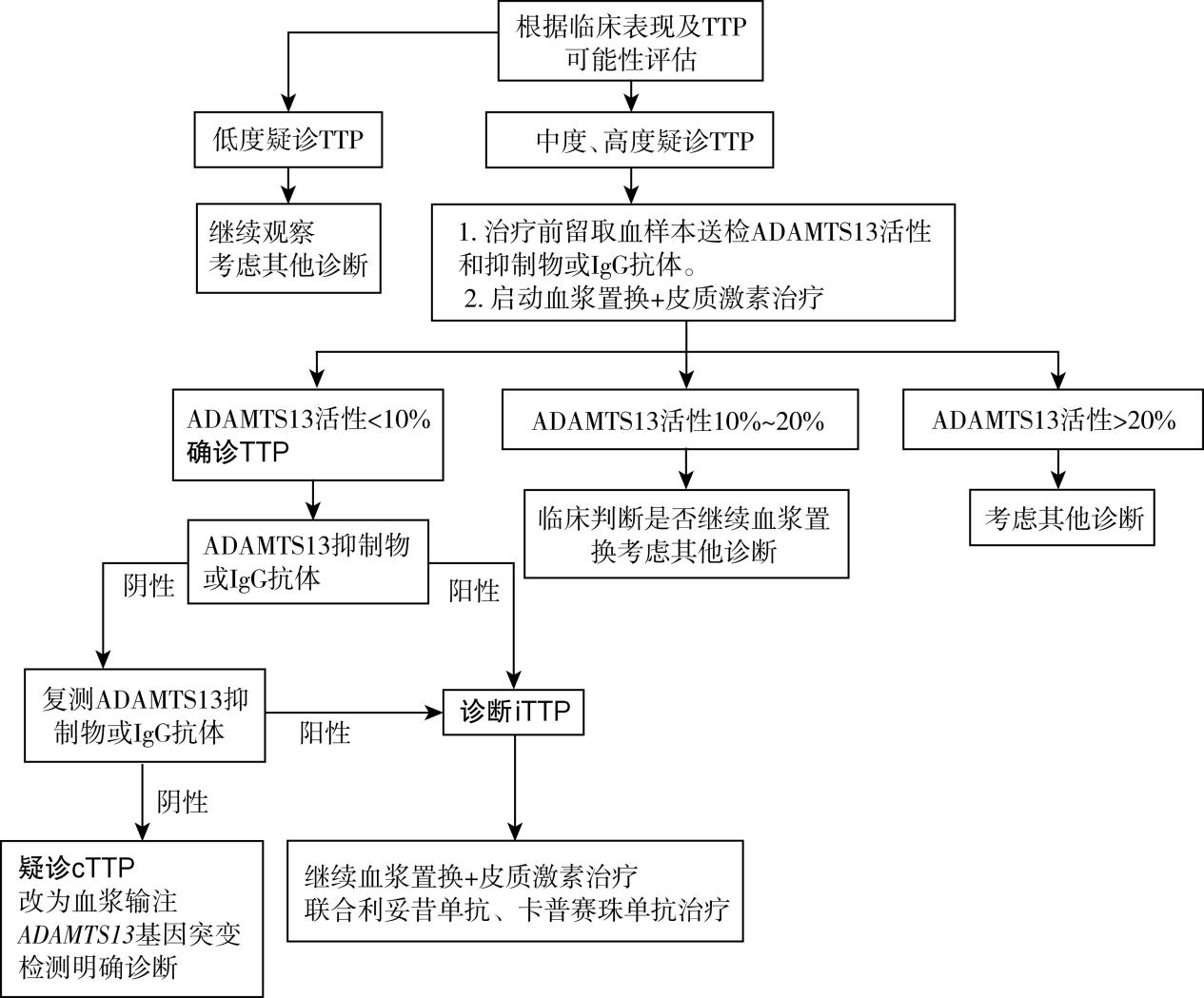 (1)对临床中度或高度疑似或确诊的TTP(尤其是iTTP)患者应立即开始治疗性血浆置换联合肾上腺皮质激素治疗,并可考虑联合卡普赛珠单抗治疗。根据待测定的ADAMTS13活性及抑制物或IgG抗体结果调整治疗:如测定的患者血浆ADAMTS13活性<10%正常水平且伴抑制物或IgG抗体阳性,符合iTTP,则继续进行上述治疗并及时给予利妥昔单抗治疗;如抑制物阴性,考虑cTTP,可停药激素、并改血浆置换为血浆输注;如患者血浆ADAMTS13活性>20%正常水平,则考虑其他诊断,改用其他相应治疗;当血浆ADAMTS13活性介于10%~20%正常水平之间,需根据临床判断是否继续或停止现行相关治疗。
