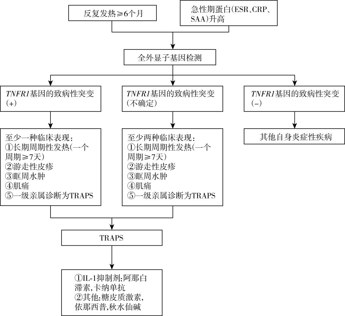 2019年儿童风湿病国际试验组织(Pediatric Rheumatology International Trials Organization, PRINTO)制定了TRAPS的分类标准。对于反复发热(症状至少存在≥6个月)并伴有急性期蛋白(ESR、CRP或SAA)升高的患者,若存在TNFR1基因的致病性突变,并伴有以下至少一种临床表现:1、长期周期性发热(一个周期≥7天);2、游走性皮疹;3、眶周水肿;4、肌痛;5、一级亲属诊断为TRAPS,或存在未证实的TNFR1基因突变,伴有上述临床表现中的至少两项,可考虑TRAPS。该方案的灵敏度为95%,特异度为99%,准确性为0.99。此外,PRINTO还提出了通过权重诊断TRAPS的方案。发热≥7天(2分),发热5~6天(1分),游走性皮疹(1分),眶周水肿(1分),肌痛(1分),阳性家族史(1分),不存在阿弗他口炎(1分),不存在咽扁桃体炎(1分),若得分≥5分,可考虑TRAPS。该方案灵敏度为87%,特异度为92%,符合率为96%。