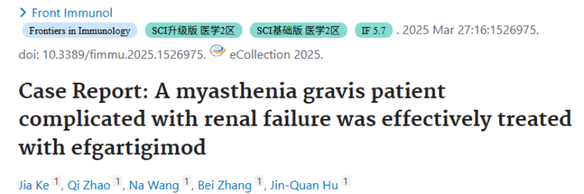 英文标题:A myasthenia gravis patient complicated with renal failure was effectively treated with efgartigimod