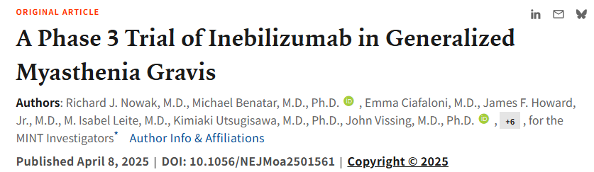 关键词:伊奈利珠单抗(Inebilizumab);全身型重症肌无力;自身抗体;CD19 B细胞;自身免疫疾病;III期临床试验;随机对照试验