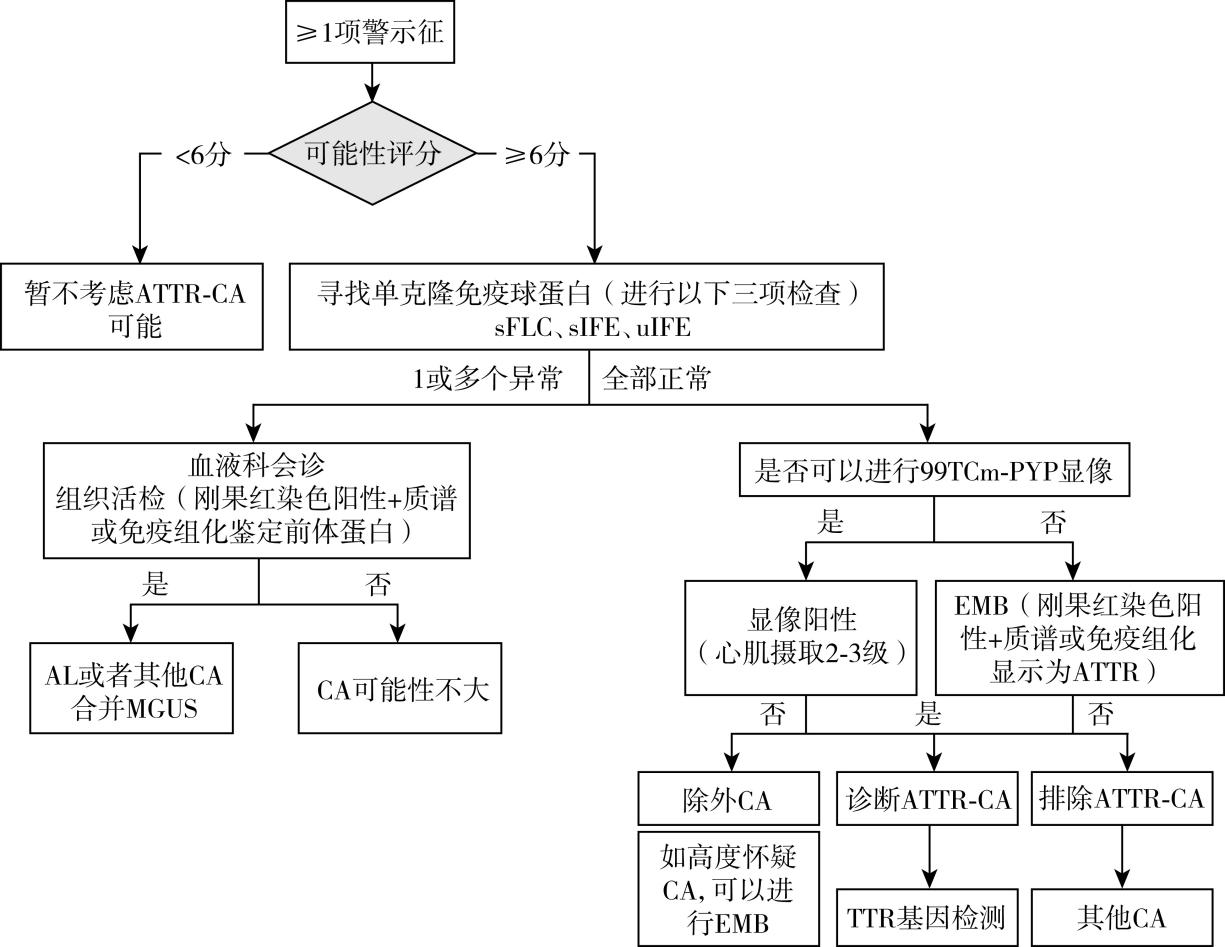 对于出现以上“警示征”的高危人群,可考虑进入以下ATTR-CA确诊流程:①完善心电图、超声心动图和CMR检查。如果心电图、超声心动图和CMR高度提示CA可能,则进入以下步骤。②单克隆免疫球蛋白检测:如果单克隆免疫球蛋白检测无异常,可进行99mTc-PYP进行确诊。不具备核素扫描检查或者99mTc-PYP结果无法明确时,建议行侵入性心内膜心肌组织活检进行确诊。如血清FLC比值异常、血清/尿IFE阳性,应请血液科会诊。③患者确诊ATTR-CA后经还需基因检测有无TTR基因突变。
