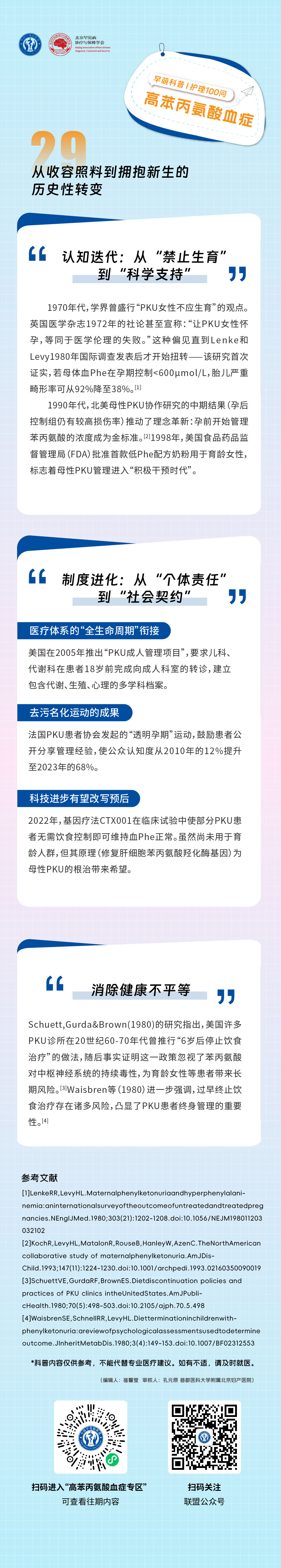 各位病友,大家好!本期主题【从收容照料到拥抱新生的历史性转变】带您了解母性PKU的管理理念从“禁止生育”到“科学支持”的转变历程。让我们携手,从被动照料走向主动新生!请大家关注每周五群内分享的疾病相关知识,持续获取更多实用信息!欢迎大家扫描长图底部二维码进入“高苯丙氨酸血症”疾病专区浏览往期精彩内容。