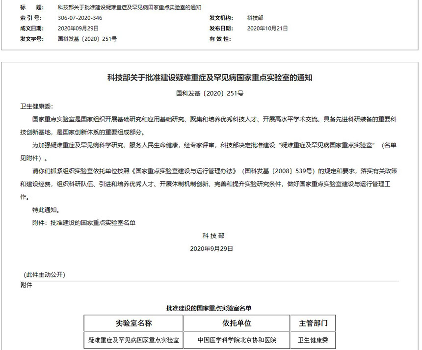 中华人民共和国科学技术部发布《科技部关于批准建设疑难重症及罕见病国家重点实验室的通知》,其中表示为加强疑难重症及罕见病科学研究,服务人民生命健康,经专家评审,科技部决定批准建设“疑难重症及罕见病国家重点实验室”。