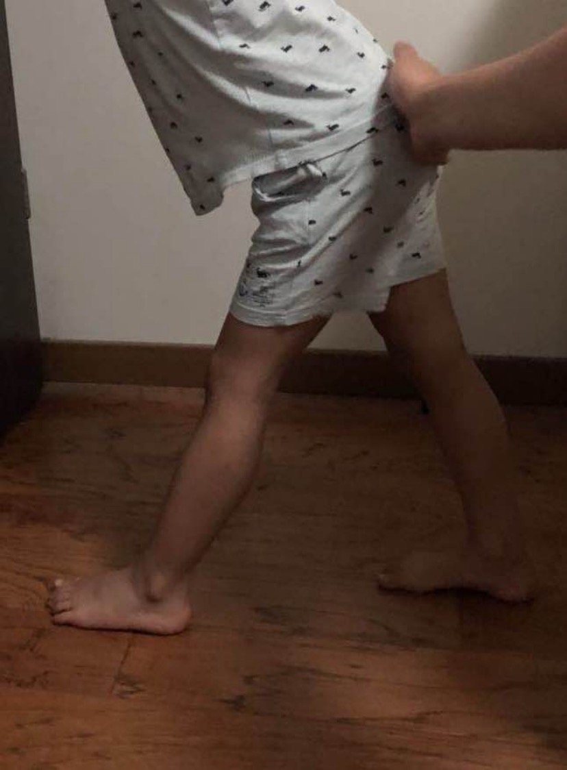 训练动作:患儿身体前倾,双手尽量向前接触脚面,膝关节伸直,双腿可略分开,但髋关节角度不宜过大(不要>45度)。躯干前倾至极限位置时,保持此位置并进行有弹性的小幅牵伸动作,动作持续30秒左右,回到躯干初始位置后再重复动作,视患儿情况酌情加减量。