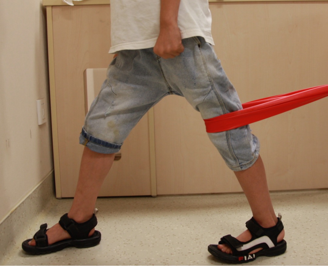 训练动作:牵伸腿后伸,在膝关节前部设置拦挡物防止后腿前移。患儿重心移至前腿,尽量挺胸挺髋,加大前后腿间的距离。静力动作不需要频繁移动,单次动作可维持1分钟左右,牵伸动作视受限情况酌情加减量。双侧交替训练。