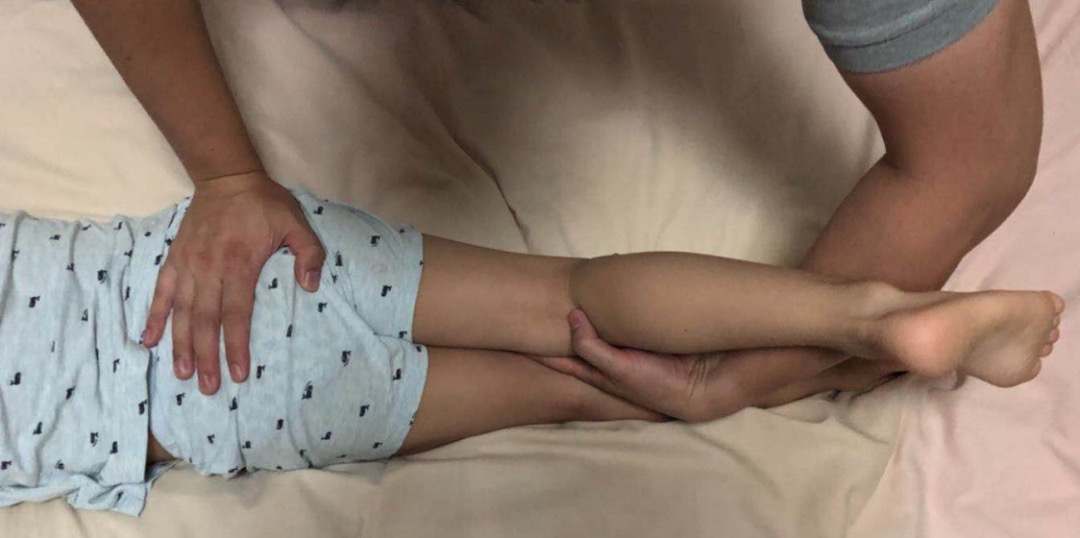 训练动作:训练者在患儿一侧,一手托住患儿同侧足踝,从床面抬起,一手轻置于膝关节上,不要用力下压膝关节。当抬起至极限位置时,保持此位置并进行有弹性的小幅牵伸动作。动作持续5秒左右,放回原位后再次抬起,如此进行10~20次,视受限情况酌情加减量。双侧交替训练。